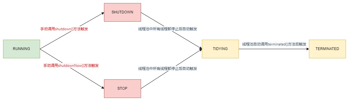 | SHUTDOWN | TIDYING | 线程池中所有线程都停止后自动触发 |