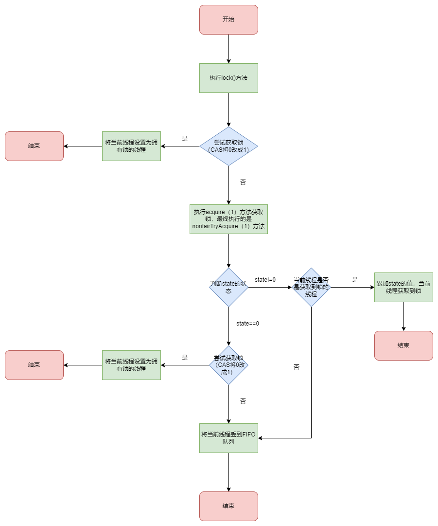 * 3. nonfairTryAcquire方法判断锁是否释放,如果释放,同样使用CAS加锁,如果没释放,判断当前线程是否是加锁的线程,是的话锁的次数+1