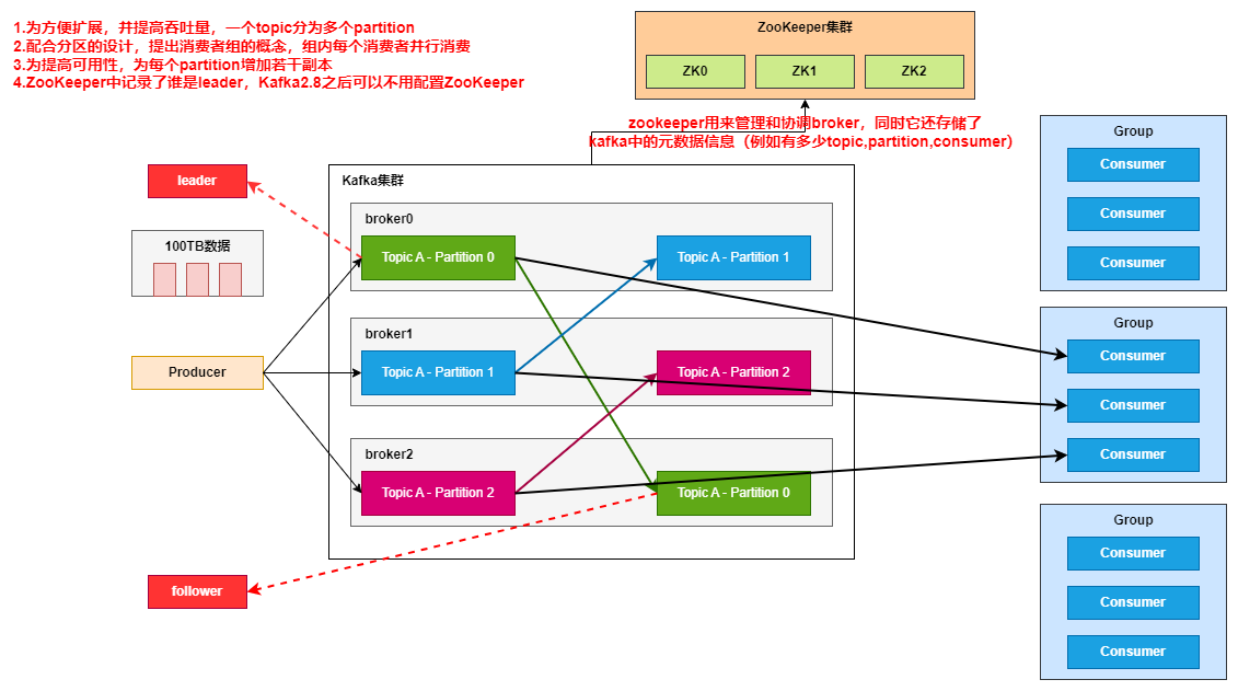 - zookeeper用来管理和协调broker,同时它还存储了kafka中的元数据信息(例如有多少topic,partition,consumer)。