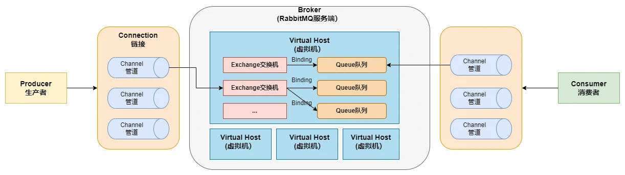 Virtual host是一个虚拟主机的概念,一个Broker中可以有多个Virtual host,每个Virtual host都有一套自己的Exchange和Queue,同一个Virtual host中的Exchange和Queue不能重名,不同的Virtual host中的Exchange和Queue名字可以一样。这样,不同的用户在访问同一个RabbitMQ Broker时,可以创建自己单独的Virtual host,然后在自己的Virtual host中创建Exchange和Queue,很好地做到了不同用户之间数据隔离的效果。比如我所在的公司就是很多个应用用一个RabbitMQ服务端的,每一个产品线的应用公用一个VirtualHost。