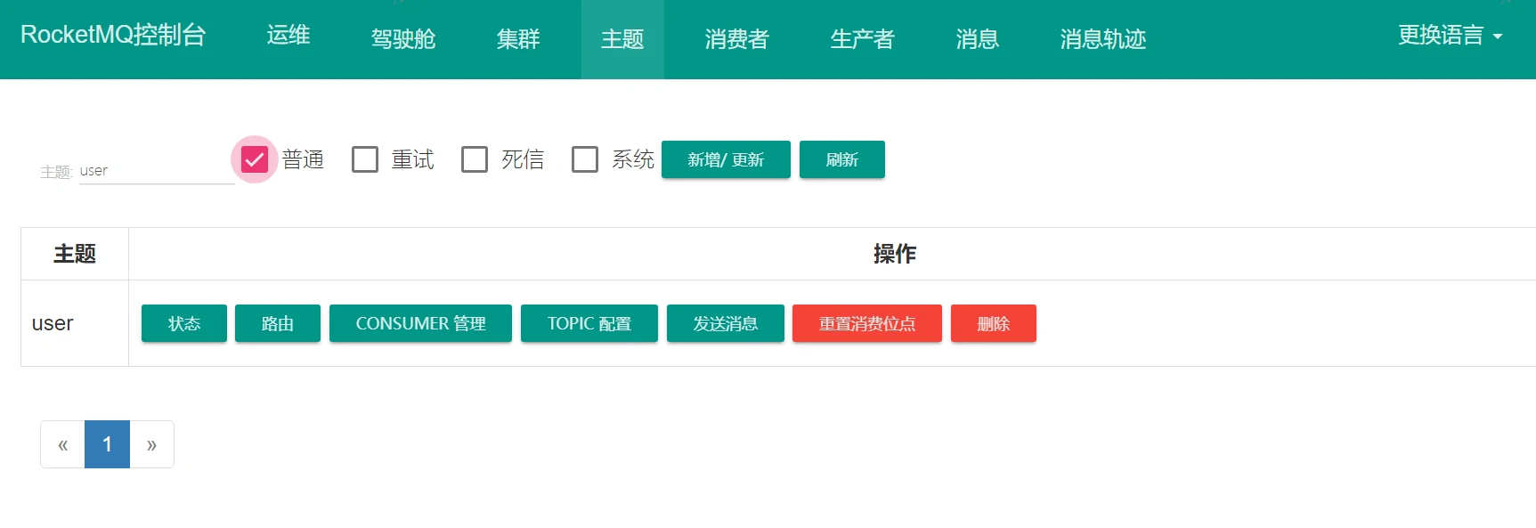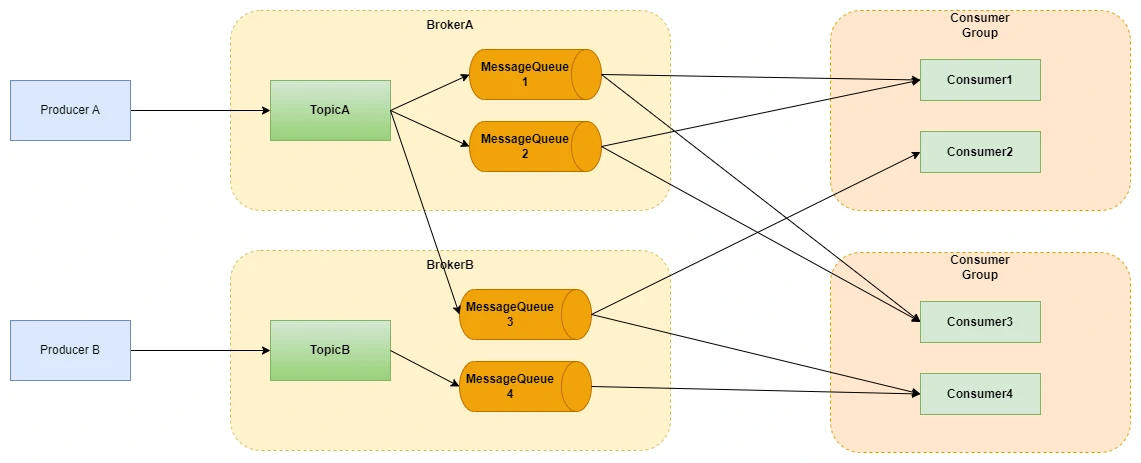 主题,类似RabbitMQ的交换机Exchange,生产者需要通过Topic发送消息到MessageQueue。