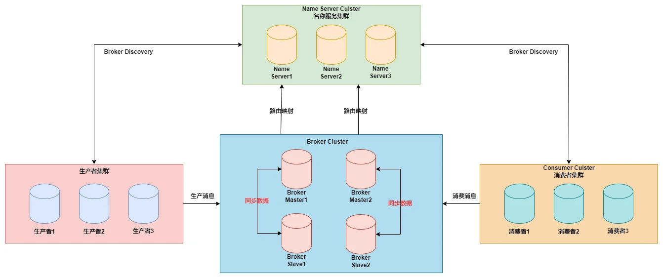 生产者和消费者都要通过NameServer的服务发现功能找到Broker,再通过Broker中的MessageQueue收发消息,可以看到NamerServer基本等价于Nacos,充当着服务发现者的角色。RocketMQ中NameServer集群中NameServer与NameServer之间相互独立,没有任何通信行为。
