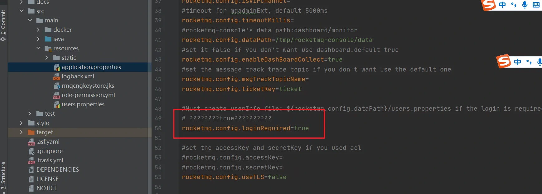 2.修改项目的application.properties文件,将其中的rocketmq.config.loginRequire配置修改为true。