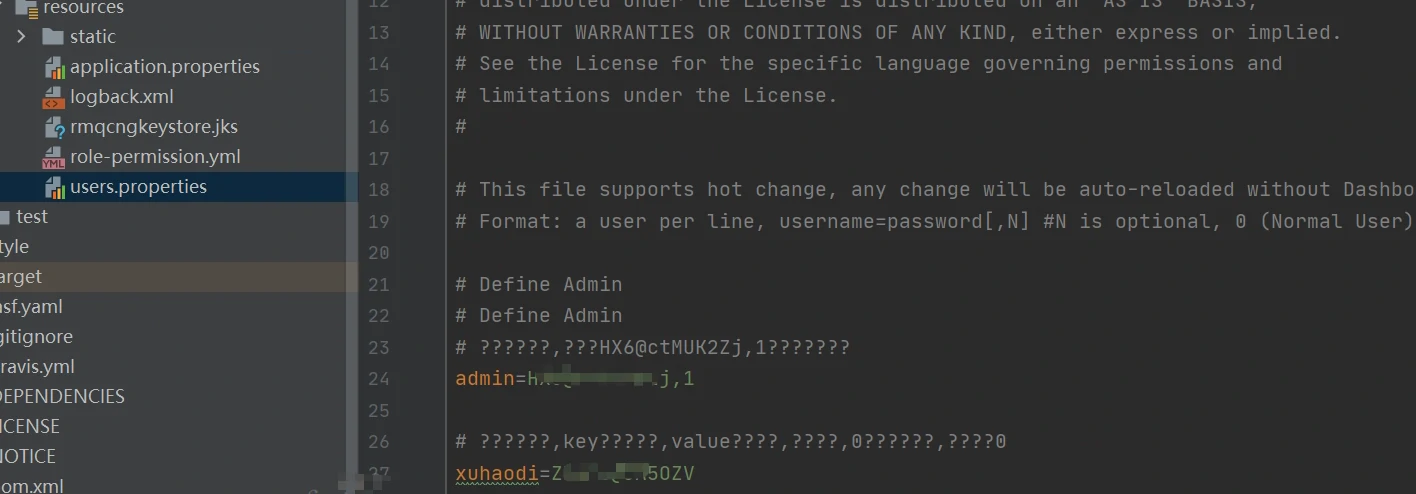 3.修改项目的users.properties文件,在其中添加属性键值对key=value,key代表用户,value的值代表密码及权限,如这里的admin=asssAAA,1即代表管理员权限,xuhaodi=xxxxaawwa则为普通用户权限